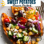 This Mediterranean Stuffed Sweet Potatoes recipe features roasted sweet potatoes filled with a refreshing mix of chickpeas, cherry tomatoes, cucumber, Kalamata olives, feta cheese, fresh herbs, and a zesty lemon oregano dressing. Perfect for a wholesome and vibrant main course that’s both satisfying and nutritious.