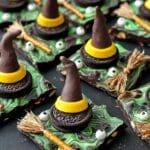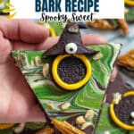 This Melted Witch Halloween Bark Recipe combines festive witch hats, brooms, and candy eyeballs on a swirled chocolate bark base. Perfect for a spooky Halloween treat, it features milk chocolate, semi-sweet chocolate, green candy melts, and fun candy decorations like bugles, pretzel sticks, and almond slivers. This easy no-bake treat is fun to make and visually impressive for Halloween parties.