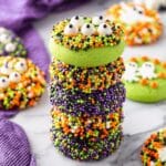 I love how forgiving this Monster Sprinkle Cookies Recipe is — you can personalize it however you like. When I bake these with my niece, she always insists on extra eyeballs and rainbow sprinkles, but I sometimes cut back to just a sprinkle “partial coat” to save on sugar and mess.