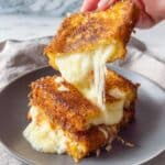 Transfer the fried sandwiches to a cutting board. I find that a serrated knife works best for cutting through the crust without squishing the melty inside. Cut carefully, stopping before you fully slice through the cheese center, then flip and finish the cut. Serve immediately — once it starts cooling, the magic starts to fade!