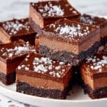 These No-Bake Fudgy Chocolate Squares combine a crunchy cookie crust with a rich, creamy chocolate filling and a shiny chocolate glaze topped with flaky sea salt. Perfect for chocolate lovers, this easy recipe requires no baking, using simple ingredients and microwave melting for a quick yet decadent dessert.