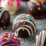 - Dip the truffles: Dip each chilled truffle into your preferred melted chocolate and place back onto the parchment paper. Decorate with sprinkles or extra drizzles of chocolate if desired.