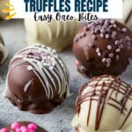Delicious no bake Oreo truffles made with crushed Oreo cookies and cream cheese, dipped in a variety of melted chocolates and decorated with sprinkles for a fun and easy treat.