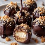 - Dip balls in chocolate: Working quickly, dip each frozen cheesecake ball into the melted chocolate coating using a fork or dipping tool, allowing excess chocolate to drip off before placing on clean parchment paper.