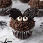 These Bat Cupcakes are a spooky and delicious Halloween treat featuring moist chocolate cupcakes topped with rich chocolate buttercream frosting and decorated with Oreo cookie wings and candy eyes to create adorable bat faces.
