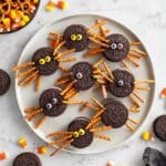 Create spooky and delicious Oreo Spiders using Peanut Butter Oreo Cookies, dark chocolate, pretzel sticks, and Reese’s Pieces. Perfect for Halloween treats, these festive snacks are easy to make and fun for kids.