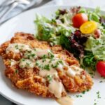 Dip each piece of flattened chicken into the flour mixture first, making sure it’s completely coated. Then into the egg, and finally, press the chicken into the pretzel crumbs. Don’t be shy about pressing the crumbs in—that’s how you get that standout crust. Heat about half an inch of oil in a sturdy skillet to 350°F (if you don’t have a thermometer, medium-high heat works—just test with a small crumb first). Fry the chicken in batches, 3-4 minutes per side, until golden and cooked through. Transfer to a rack over a baking tray and keep warm in the oven on the lowest setting while you finish the rest.