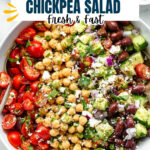 A refreshing and easy 10-minute Mediterranean chickpea salad featuring a colorful mix of vegetables, tangy feta cheese, and a zesty homemade dressing. Perfect for a light lunch or side dish.