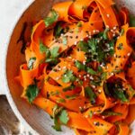 A fresh and vibrant Raw Carrot Salad featuring thinly sliced carrot ribbons tossed in a tangy and slightly sweet dressing made with apple cider vinegar, balsamic vinegar, and agave syrup. Enhanced with fresh herbs and optional sesame seeds, this light salad is perfect as a refreshing side or a healthy snack.