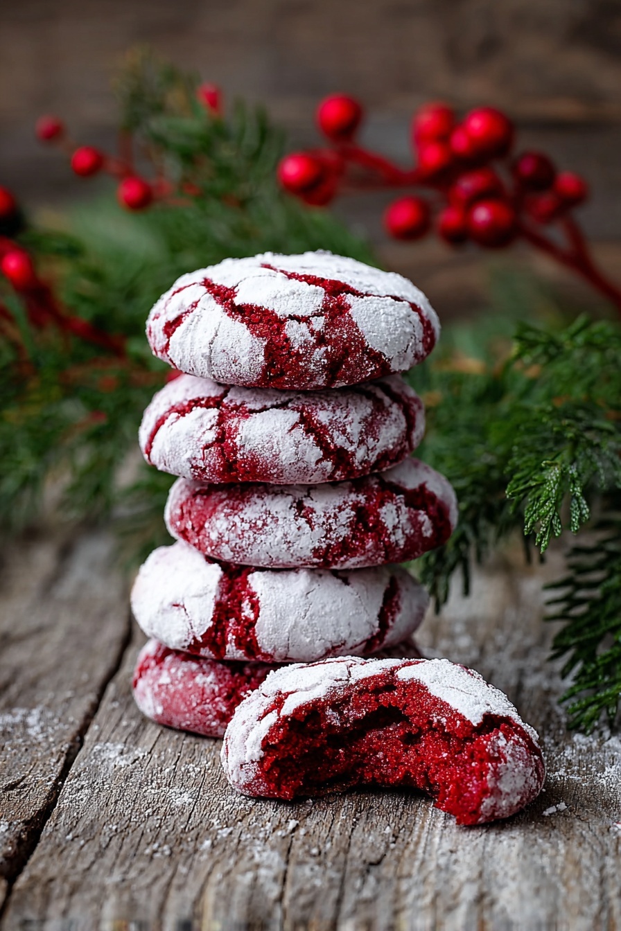 For holiday parties or gift-giving, stack these Red Velvet Crinkle Cookies in a clear cellophane bag tied with a bright ribbon—it looks so festive and inviting. I’ve also arranged them in mason jars layered with small candies or nuts as a cute and tasty gift idea. On a dessert table, placing them on a tiered cake stand alongside red and white treats makes a stunning display.