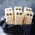 As soon as each bar is dipped, press two dark chocolate chips onto the white chocolate half to create adorable ghost eyes. Then let the bars set at room temperature or in the fridge for about 10 minutes until the chocolate hardens. And voilà – your Rice Crispy Ghost Bars are ready to haunt your taste buds!