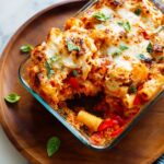 A delicious and hearty Baked Ziti with Roasted Vegetables featuring tender roasted cauliflower, bell peppers, and onions layered with pasta, marinara sauce, fresh basil, and a blend of mozzarella and cottage cheese. This comforting Italian-inspired casserole is perfect for a family dinner and packed with flavor.