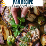 A flavorful and easy Sheet Pan Pork Chop Supper featuring bone-in pork chops roasted with Brussels sprouts, Fuji apple wedges, and red onion, finished with a balsamic drizzle and fresh herbs. Perfect for a balanced, one-pan weeknight dinner.