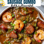 A hearty and flavorful Shrimp and Sausage Gumbo featuring a perfectly cooked caramel-colored roux, aromatic vegetables, spicy sausage, tender shrimp, and okra simmered in a rich broth for a classic Louisiana-style dish.