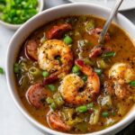 A hearty and flavorful Shrimp and Sausage Gumbo featuring a perfectly cooked caramel-colored roux, aromatic vegetables, spicy sausage, tender shrimp, and okra simmered in a rich broth for a classic Louisiana-style dish.