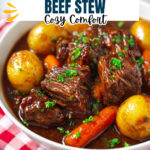 This easy slow cooker beef stew recipe features tender chunks of beef chuck simmered with pearl onions, baby carrots, and potatoes in a rich broth of red wine and beef stock, infused with fresh herbs and a touch of Worcestershire sauce. Perfectly slow-cooked to develop deep, hearty flavors, it’s an ideal comforting meal for any occasion.