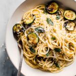 While frying zucchini, get a large pot of salted water boiling and cook your spaghetti until just al dente — usually about one minute less than package instructions suggest. Save at least 2 cups of pasta water before you drain it, as it’s magic for creating that silky, creamy sauce when combined with parmesan.