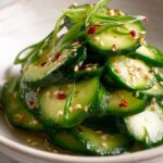 A refreshing and spicy cucumber salad featuring crunchy mini cucumbers dressed in a flavorful blend of soy sauce, rice vinegar, sesame oil, honey, garlic, and chili flakes, garnished with green onions and sesame seeds. Perfect as a light side dish or a vibrant appetizer.