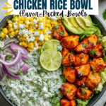 A vibrant and flavorful Street Corn Chicken Rice Bowl featuring tender spiced chicken, creamy street corn topping, and zesty cilantro lime rice, perfect for a satisfying and easy weeknight meal.