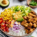 - Assemble Street Corn Chicken Bowls: Start with a warm base of cilantro lime rice. Top with cooked chicken, then spoon over the creamy street corn topping. Finish with your favorite optional toppings such as lettuce, pico de gallo, onions, jalapeno, diced avocado, or tortilla chips. Serve immediately and enjoy!