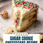 This Sugar Cookie Cheesecake combines a festive sugar cookie crust with scrumptious cookie dough balls baked right into a creamy cheesecake, topped with a luscious white chocolate ganache and decorated with Christmas sprinkles for a perfect holiday dessert.