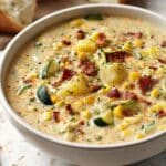 A comforting and creamy Summer Corn and Zucchini Chowder packed with fresh vegetables, tender potatoes, and smoky bacon. This hearty chowder combines sweet corn, zucchini, and yellow squash with savory herbs and spices, finished with a touch of half and half for richness. Perfect for a warm summer evening or anytime you crave a satisfying bowl of soup.