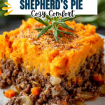 A comforting Sweet Potato Shepherd’s Pie featuring a hearty ground beef or lamb filling with vegetables and a smooth, spiced mashed sweet potato topping baked to perfection in a skillet or casserole dish.