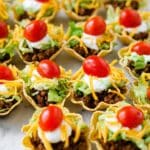 I don’t recommend freezing assembled taco bites because the chips get soggy, but you can freeze the cooked taco meat for up to 3 months. Just thaw and reheat when you’re ready.