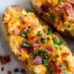 Delicious Twice Baked Potatoes featuring creamy butter, crispy bacon, and a blend of Parmesan and sharp cheddar cheeses, baked to golden perfection and topped with melted cheese and green onions.