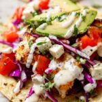 I’ve found that while the fried vegan fish is best fresh, leftovers can be stored in an airtight container in the fridge for up to 2 days. Keep toppings separate and fresh by storing cabbage, tomato, and avocado parts apart to avoid sogginess.