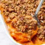 For leftovers, I like reheating in a 350°F oven, loosely covered with foil for about 20 minutes to warm through. Then remove foil for the last 5-7 minutes to crisp the pecan topping. It’s not quite as crunchy as fresh but still delicious!
