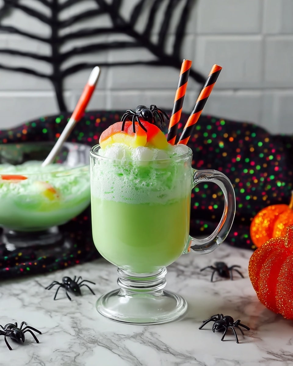 Witch’s Brew Punch is a fun and festive Halloween beverage featuring a fizzy blend of Sprite, pineapple juice, and lime sherbet with a spooky green hue and gummy worms for a delightful treat.